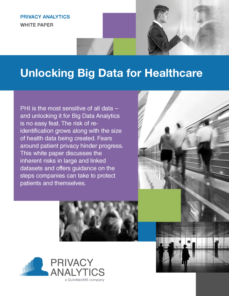 PHI is the most sensitive of all data – and unlocking it for BDA is no easy feat. Fears around patient privacy hamper progress. As health data repositories grow, more and more patient data is being linked from multiple sources. The risk of re-identification grows along with the size of health data being created. Petabytes of health data are sitting in siloes that could hold important answers to improving patient outcomes and minimizing the cost of healthcare delivery. Storage of the data is the easy part. Deciding how to unlock the data so it can be used for analysis or shared with an ecosystem of partners is the greater challenge. De-identification allows for the unlocking of health data for secondary use, but only a risk-based method can address the sensitivity and multitude of data. Understanding the privacy risks and finding the balance between data access and data anonymity is central to BDA’s future success.